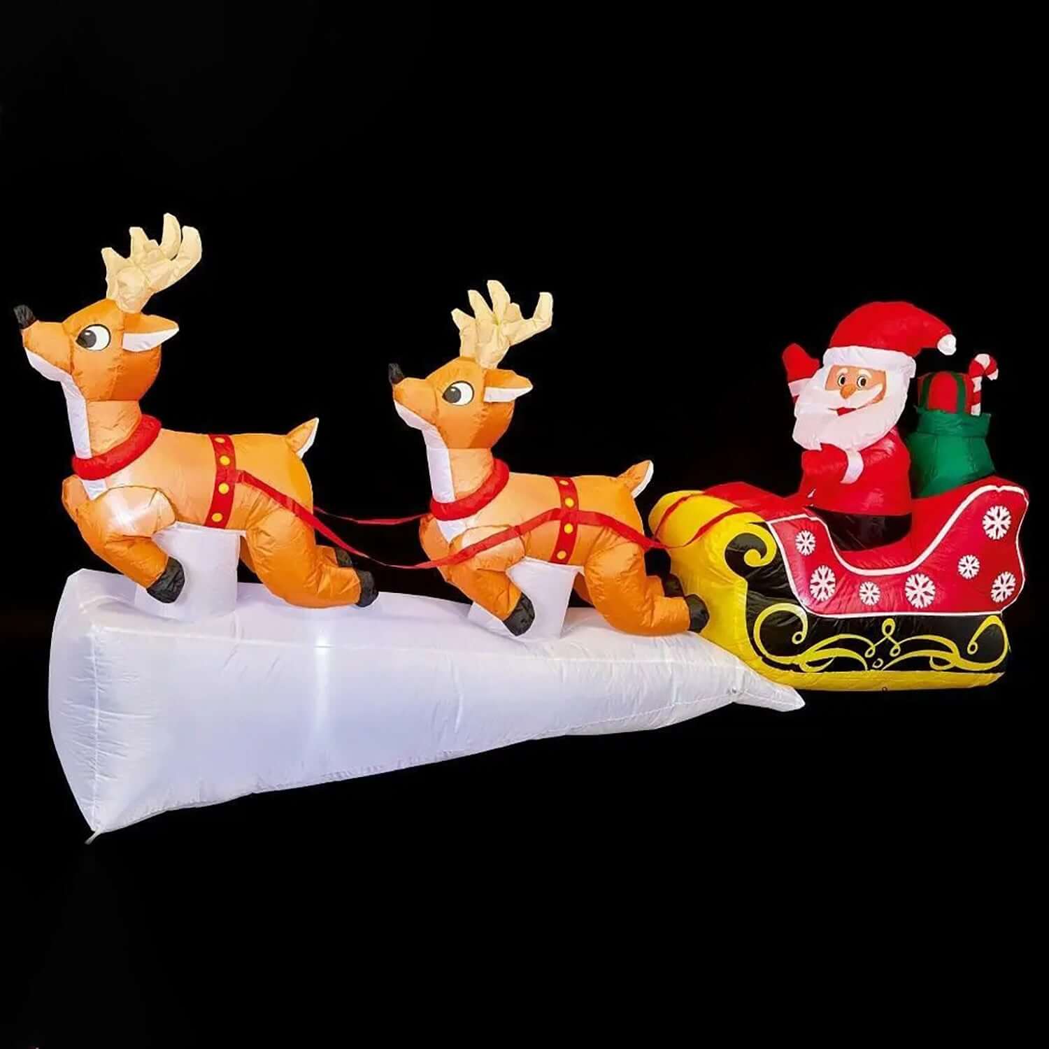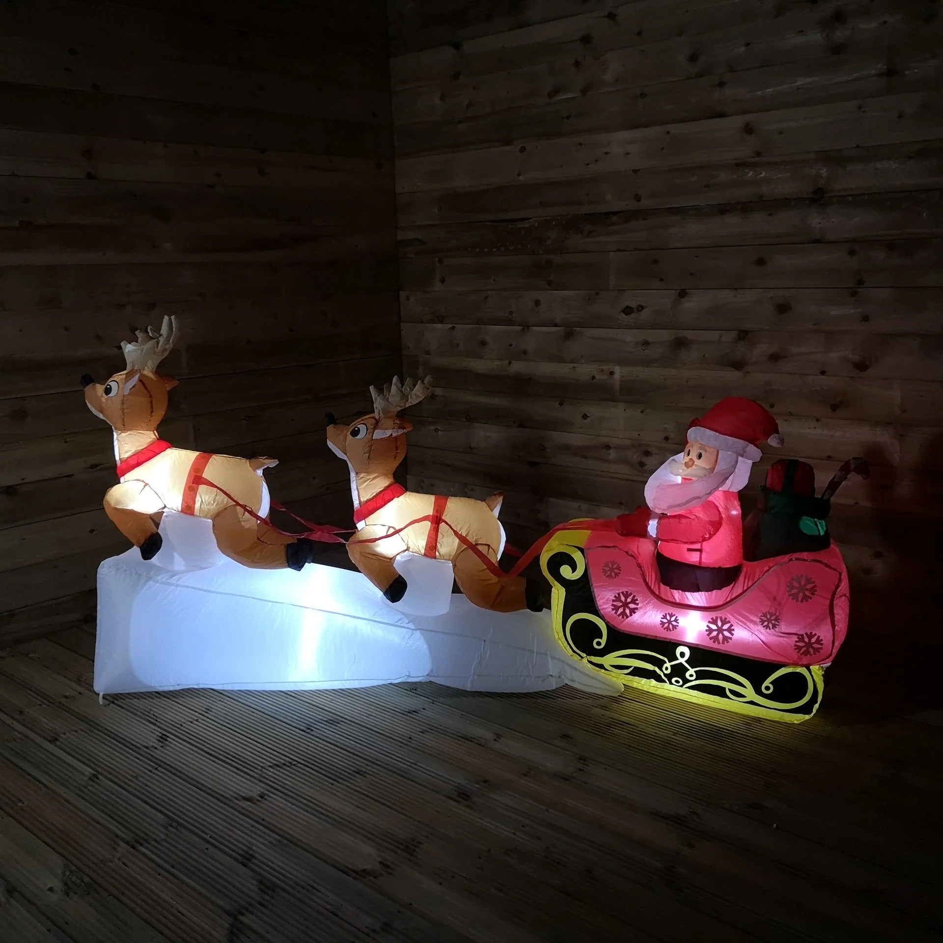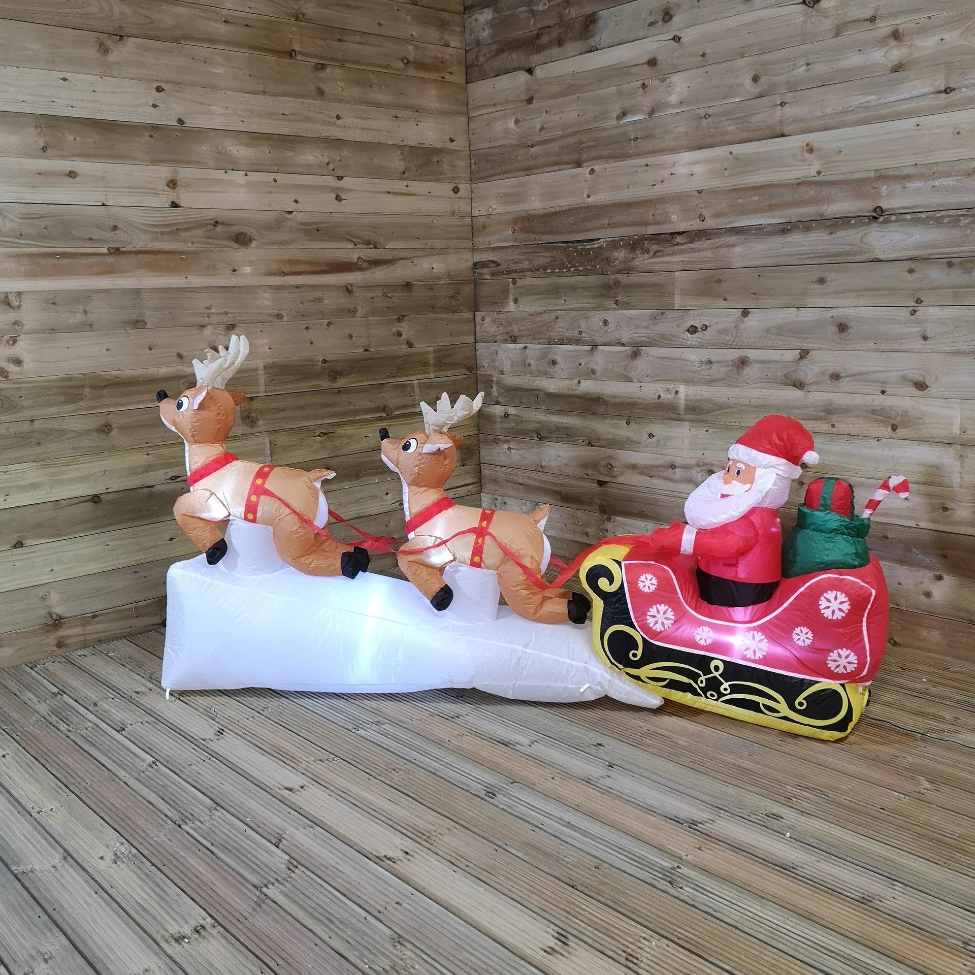 - Charming: Transform your home into a winter wonderland with this brand new 2.4m Inflatable Santa on Sleigh with Reindeers! Watch as Santa waves from his sleigh, pulled by two charming reindeers, lighting up your home and spreading holiday cheer.